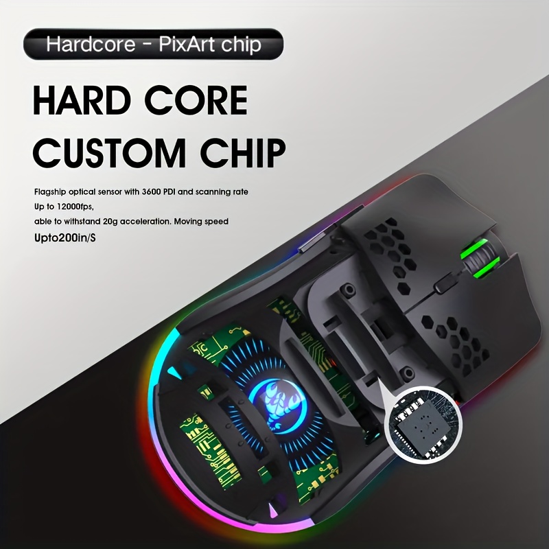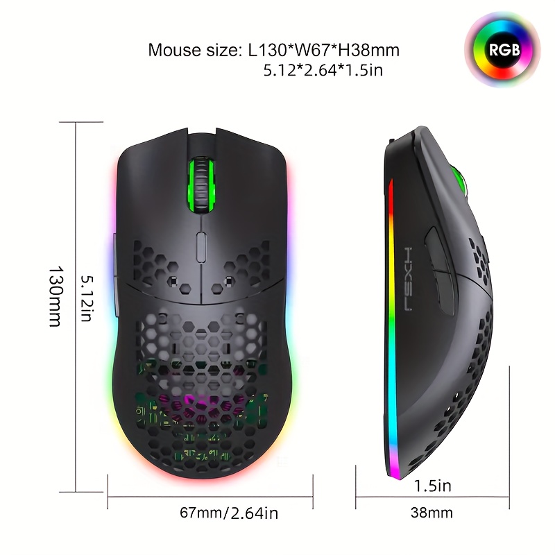 Lightweight Honeycomb Shell: The lightweight honeycomb design greatly reduces the weight of the gaming mouse, improves the flexibility of the mouse, enhanced the heat dissipation performance, and using more smoothly. Made by high-quality ABS material, ergonomic design, comfortable surface touch, exquisite design let you use it more comfortable and will not feel sore after long time use 2.4GHz Wireless Mouse: The wireless mouse adopt advanced 2.4GHz wireless transmission technology. Faster signal transmission, response speed with almost no delay, ensure great using experience and enhance game performance. Mini USB wireless receiver is located in the slot at the bottom of the mouse, plug it into the computer USB port, plug and play, 10 meters wireless receiving distance Colorful RGB Backlight: This 2.4G wireless mouse equipped with up to 6 RGB lighting effects. You can switch the RGB mode through the bottom button. The light effect makes you more cool and interesting when using at night. You can also turn off the light mode at any time through the switch button at the bottom 4-Level Adjustable DPI: Through the DPI button you can adjust in the range of 800-1600-2400-3600. 6 buttons design, and 2 additional buttons at the bottom of the mouse: RGB light mode adjustment button, switch button. Wireless mouse, help you get rid of the shackles of cables, more convenient and free, 10 million button life and professional lC positioning accuracy, your ultimate choice Power Saving and Wide Compatibility: Built-in 750mAh rechargeable battery with three-level power saving mode: ①Three seconds into the first sleep light flashing continuously, ②1 minute or so to enter the secondary sleep, intermittent flashing lights, ③8 minutes or so, go to level 3 sleep, the light goes out. Then press any key to wake up the sleeping mouse, very intelligent. Applicable system: Windows(Windows XP/Vista/7/8/Server 2003/2000/Win10, etc.) Mac OS(Mac OS 10.10 above is recommended)