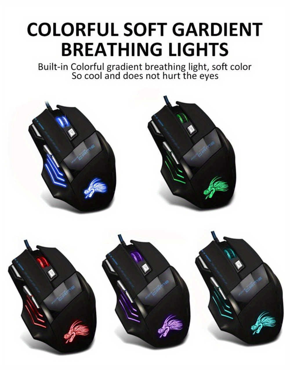 This wired mouse is black,and the backlight breathing light will automaitically change aolour when in use. Feature: