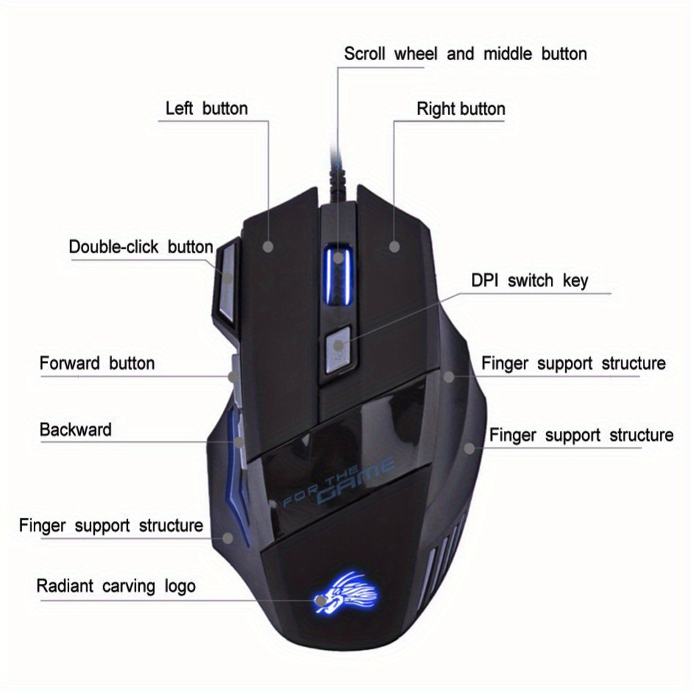 Ajustable DPI Switch: 1000DPI(Red Light) / 1600DPI(Green Light) / 2400DPI(Blue Light) / 3200DPI(White Light)/5500DPI(Orange Light);